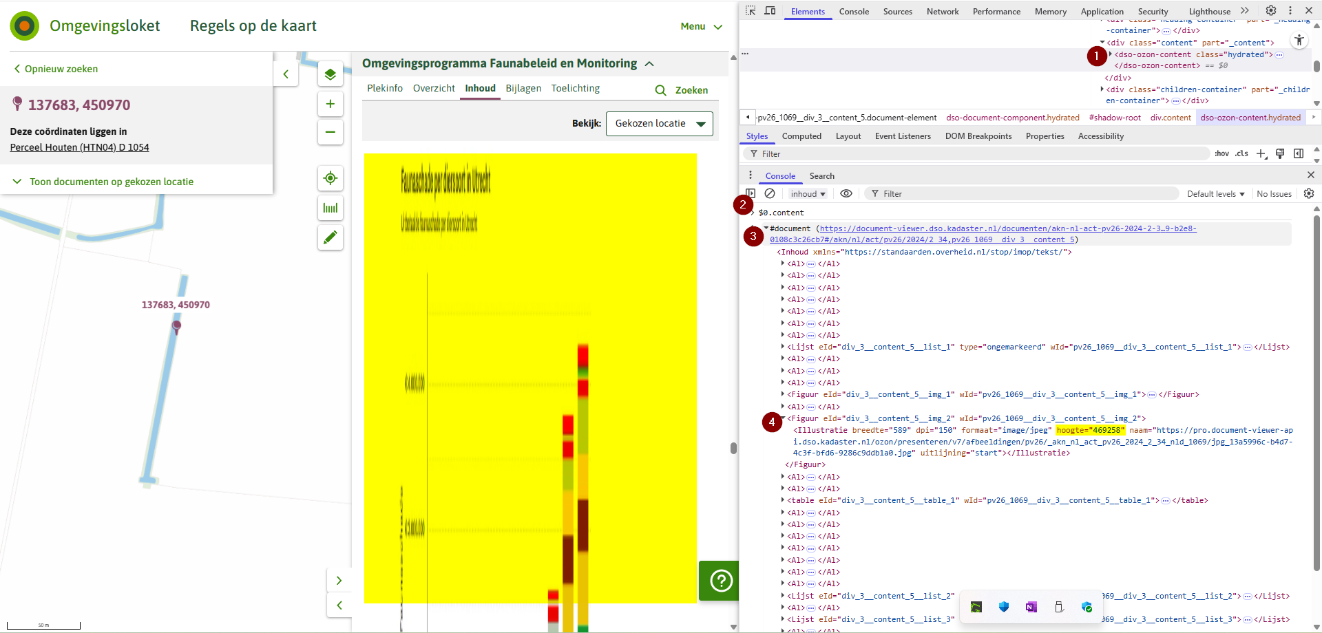 Het component maakt gebruik van de attributen hoogte, breedte en dpi om vooraf ruimte te reserveren op de pagina. De afbeelding wordt daarna ingeladen zonder dat de hoogte van de content verandert. Dit is nodig om correct te kunnen scrollen naar specifieke punten in het omgevingsdocument. Zonder deze reservering zou de afbeelding content kunnen overschrijven, waardoor gescripte scrollacties op een verkeerde plek terechtkomen.